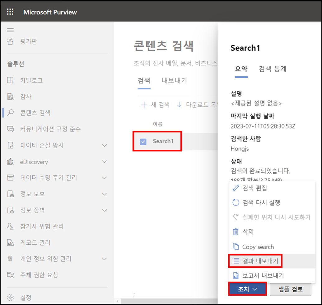 생성된 검색을 선택 > 조치 > 결과 내보내기 클릭