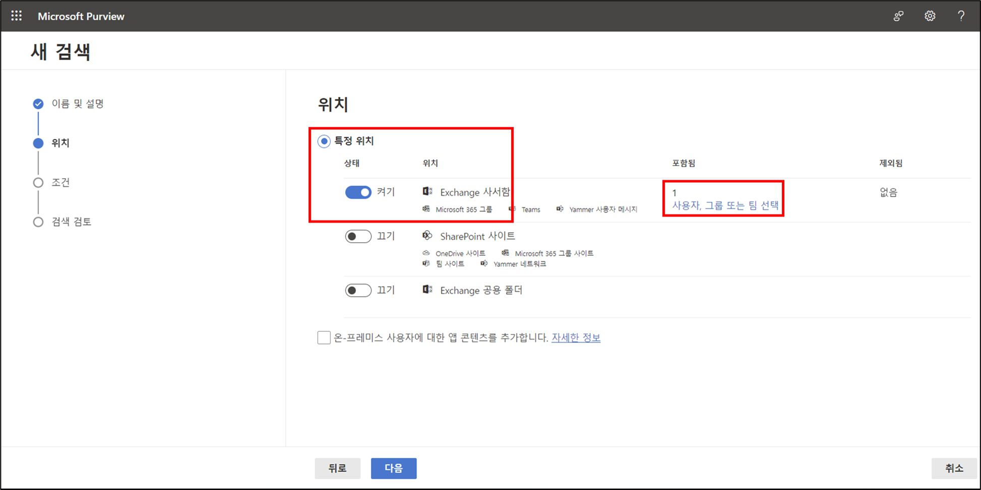 Exchange 사서함 선택 > 검색할 사용자 지정 > 다음 클릭