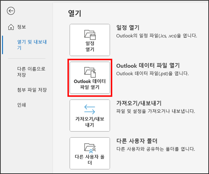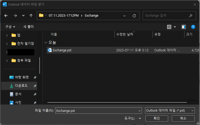 방금 다운 받은 폴더에서 pst 파일을 찾아 열어줍니다.