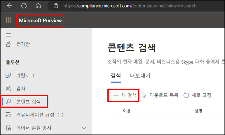 https://compliance.microsoft.com/ 에 관리자 계정으로 접근 > 콘텐츠 검색 > 새 검색 클릭