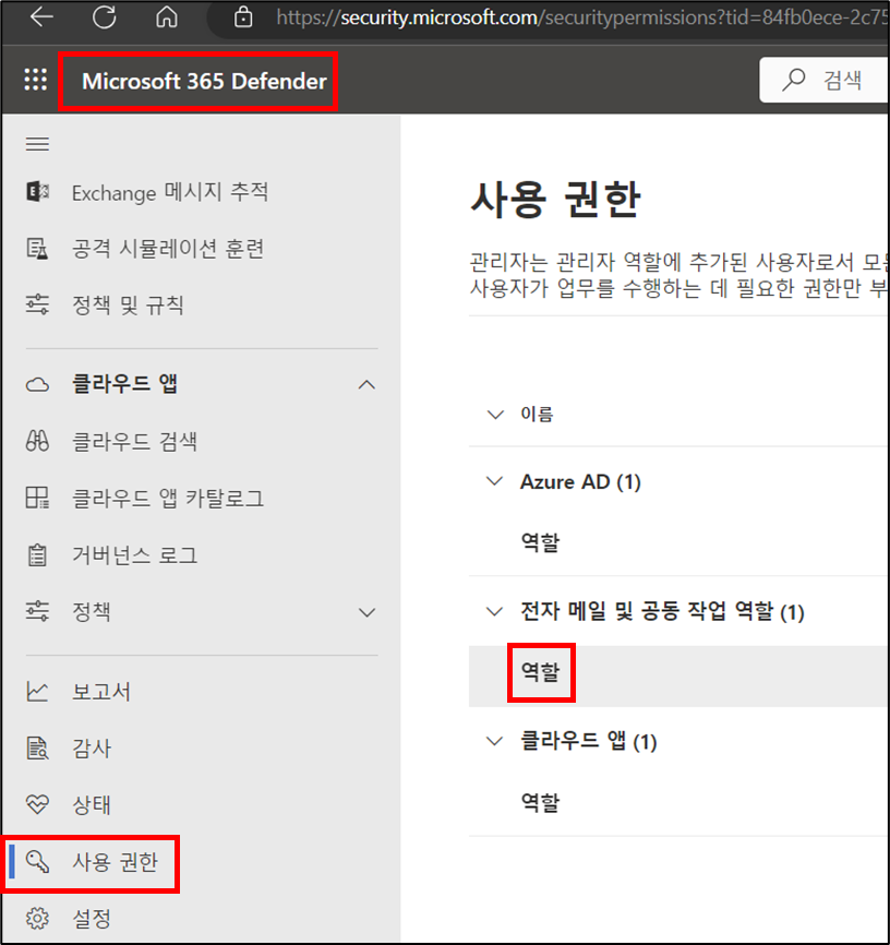 Microsoft 365 Defender 포탈(https://security.microsoft.com/) 에 관리자 계정으로 접근 > 사용 권한 > 전자 메일 및 공동 작업 역할 – 역할 클릭