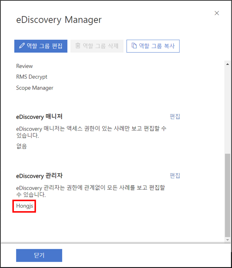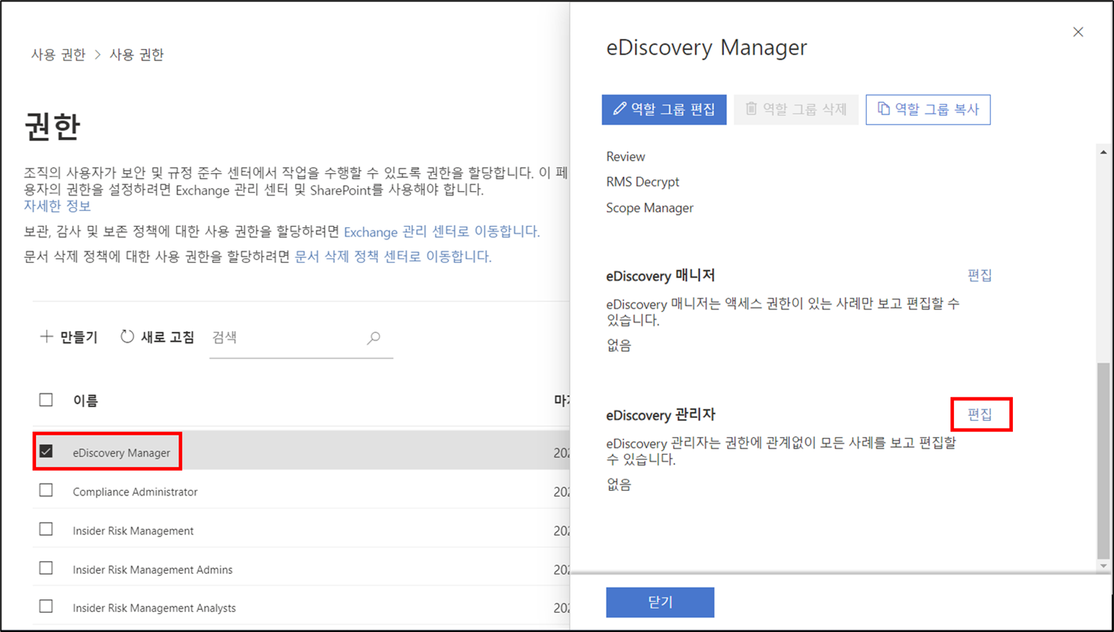eDiscovery Manager 선택 > eDiscovery 관리자 우측 편집 클릭