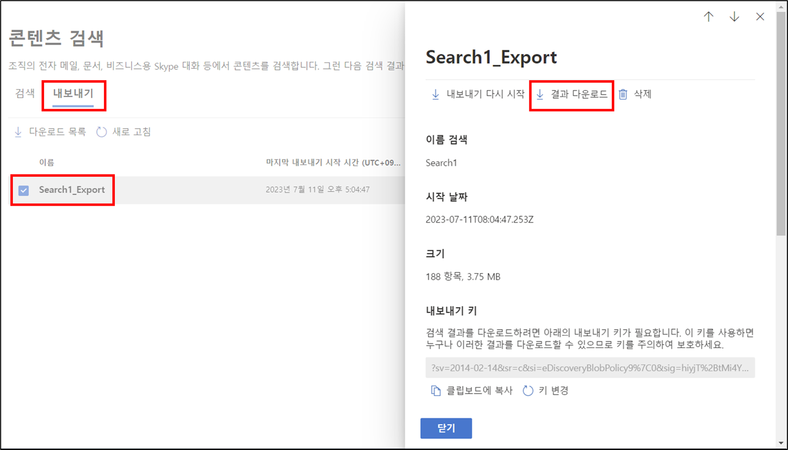 내보내기 > 생성된 내보내기 작업 선택 > 결과 다운로드 클릭