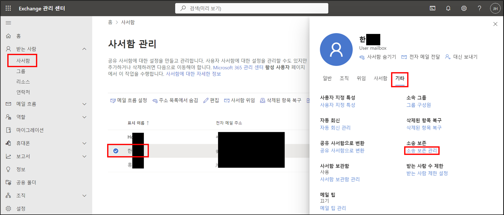 Exchange 관리 센터에 admin 권한의 계정으로 접근 > 사서함 > 사서함 선택 > 기타 > 소송 보존 관리 클릭