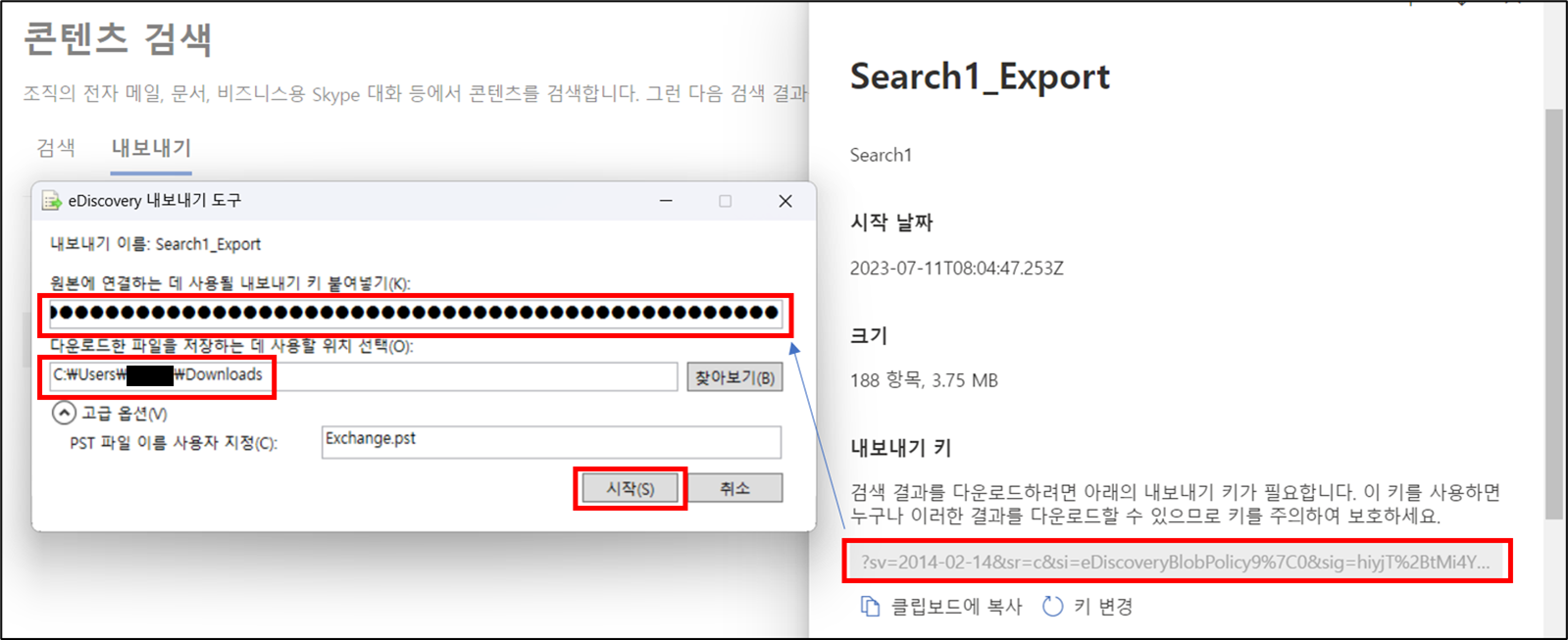 eDiscovery 내보내기 도구에 내보내기 키를 붙여 넣고, 파일을 저장할 위치를 설정한 후, 시작 버튼을 클릭합니다.