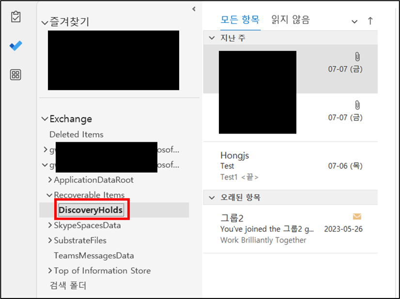 pst 파일을 가져온 것을 확인할 수 있으며 DiscoveryHolds 폴더로 가보면 메일 데이터들을 확인할 수 있습니다.