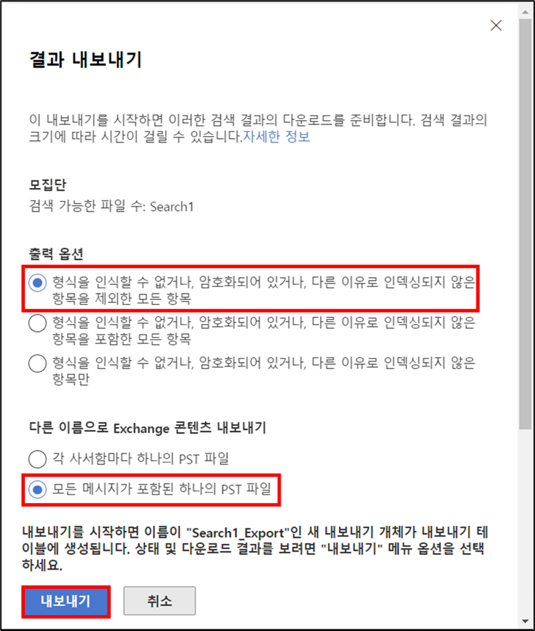 옵션들을 선택하여 내보내기를 클릭합니다.