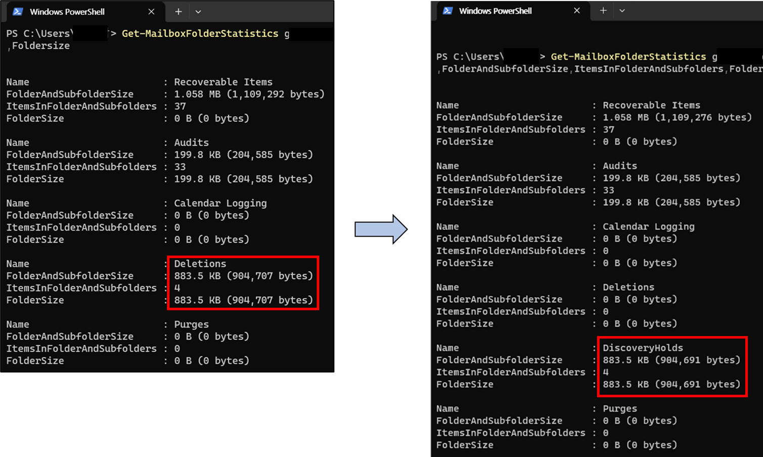 Get-MailboxFolderStatistics {사용자 UPN} -FolderScope RecoverableItems | FL Name,FolderAndSubfolderSize,ItemsInFolderAndSubfolders